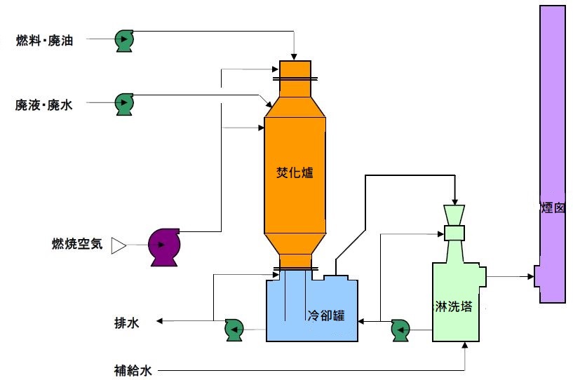 廢液燃燒裝置主要由負責燃燒的焚化爐、以及冷卻焚燒廢氣的驟冷罐所構成。