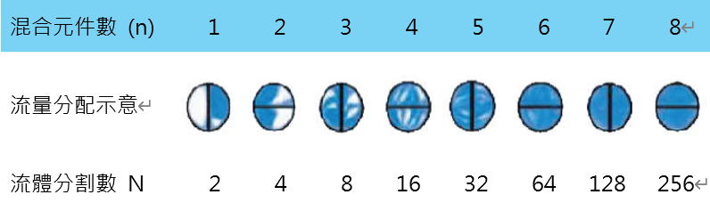 流體通過交錯排列之混合元件時持續被分割與重組: